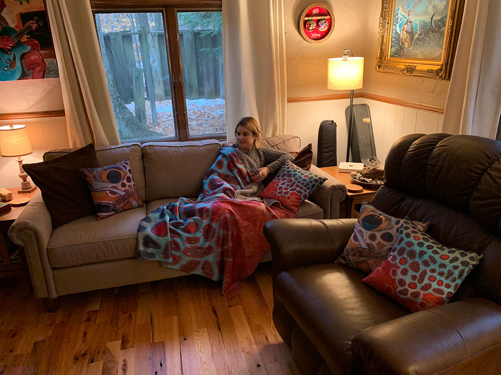 - 1 Brown Trout Flank Sherpa Blanket (50 x 60″ fully printed one one side with Brown Trout Flank Pattern, grey Sherpa on the other)
