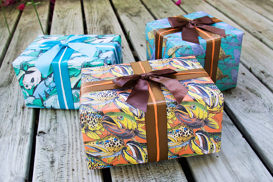 Available Now! 3 New DeYoung Gift Wrap Patterns, available in a Brown Trout, Hex and Saltwater Pattern. Two 20 x 29″ folded sheets come will come in a bag.